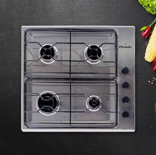 Anafe a gas de Acero Inoxidable de cuatro hornallas, encendido a una sola mano, rejilla de alambre enlozado. Medidas ancho: 60cm , alto: 8 cm , prof: 55 cm. Origen Argentina.