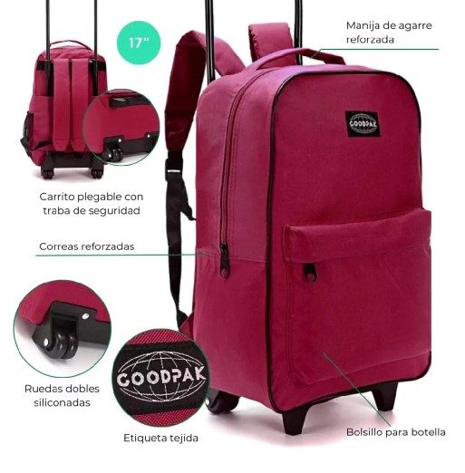 Medidas Alto 43 cm x Ancho 30 cm x Profundidad 17 cm. Proporciones ideales para llevar cuadernos, libros y todo lo necesario sin perder comodidad. Fabricada en poliéster de alta calidad, resistente al desgaste y fácil de limpiar, asegurando durabilidad y protección para sus pertenencias. Compartimento principal espacioso Facilita el guardado de carpetas, útiles y objetos personales, optimizando el espacio interior. Manija superior de agarre Permite un traslado rápido y seguro, ideal para movimientos cortos. Tiras ajustables acolchadas brindan máximo confort en los hombros, adaptándose a distintas alturas y edades. El sistema de carro robusto y de fácil manipulación mejora la movilidad, reduciendo el esfuerzo al transportar la mochila. Práctico bolsillo lateral para llevar botellas de agua o jugos, promoviendo la hidratación durante todo el día. Origen China.