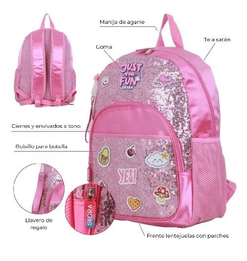 Tipo de Mochila: espalda Medida: 30×42.5x15cm Material: Poliéster Manija de agarre Tela satén Cierres y envivados a tono Bolsillo para botella Llavero de regalo Frente lentejuelas con parche, 17 pulgadas
