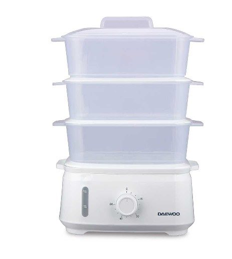TIMER DE 60 MINUTOS CON ALARMA, APAGADO AUTOMÁTICO, IDEAL PARA PREPARAR TODO TIPO CARNES, VERDURAS, ARROZ Y HUEVOS, 3 BANDEJAS PARA COCINAR DISTINTOS ALIMENTOS A LA VEZ, TANQUE DE AGUA DE 1,8 LITROS, BANDEJAS APILABLES Y ENROLLA CABLE QUE AHORRAN ESPACIO. CAPACIDAD: 9 Litros. POTENCIA 900 WATTS. ORIGEN CHINA.